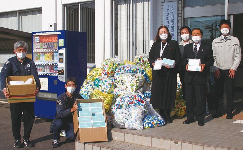ふたの山やマスクの箱とKビジョン、市社協の人たち=下松市社会福祉協議会にて