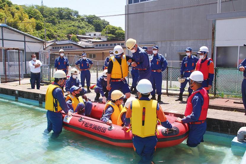 山口県下松市の下松市消防団(守田宜生団長)の救助用ゴムボート訓練が29日、下松小のプールで開かれ、浸水被害時の要救助者の救出を想定した訓練を展開した。 同消...