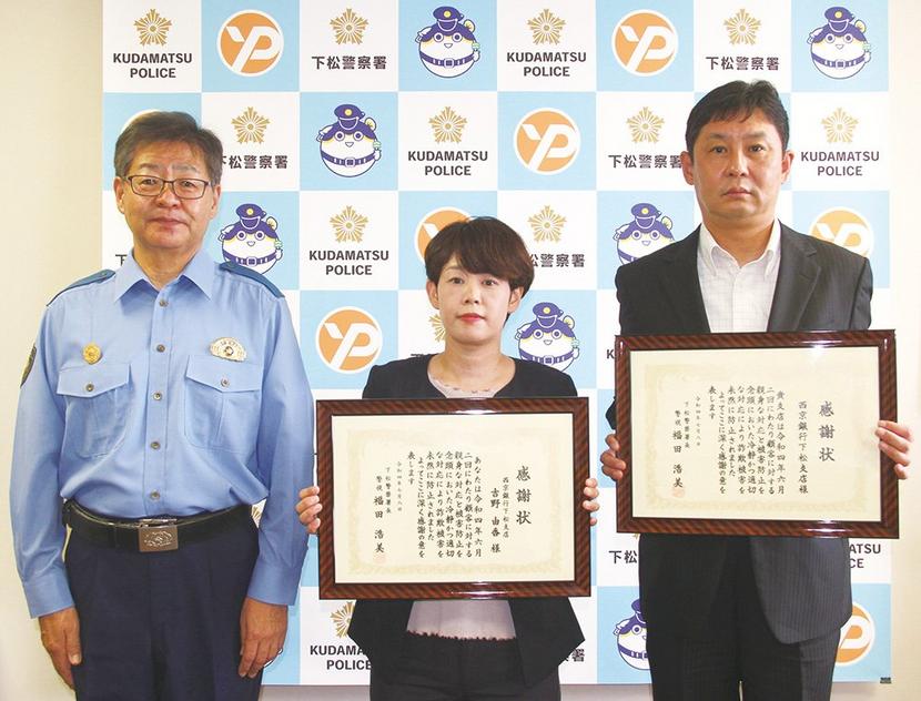 即座に暗証番号変更、口座凍結 下松警察署は8日、詐欺被害を未然に防いだ功労で、山口県下松市北斗町の西京銀行下松支店(岡谷猛支店長)と、同支店の吉野由香主任(4...