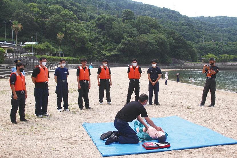 下松警察署(福田浩美署長)の水難救助訓練が26日、山口県下松市笠戸島のはなぐり海水浴場で開かれた。中堅・若手の署員13人が浮き輪やライフジャケットを使っておぼ...
