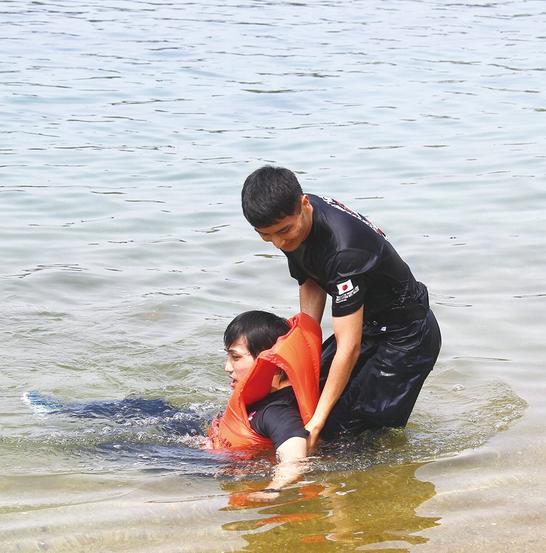 おぼれた海水浴客役を救助する署員