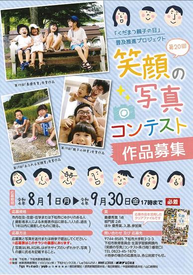 山口県下松市の第20回笑顔の写真コンテスト(新周南新聞社など後援)の作品募集が1日から始まった。締め切りは9月30日(金)午後5時。 市政推進のキーワードの...