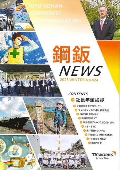 巻頭は田辺敏幸社長の年頭あいさつ。今年の課題に、GigEプロジェクト(システム更新)の完成・仕上げ▽新設備の収益化と追加新設備の建設▽生産性向上と教育拡充▽環...