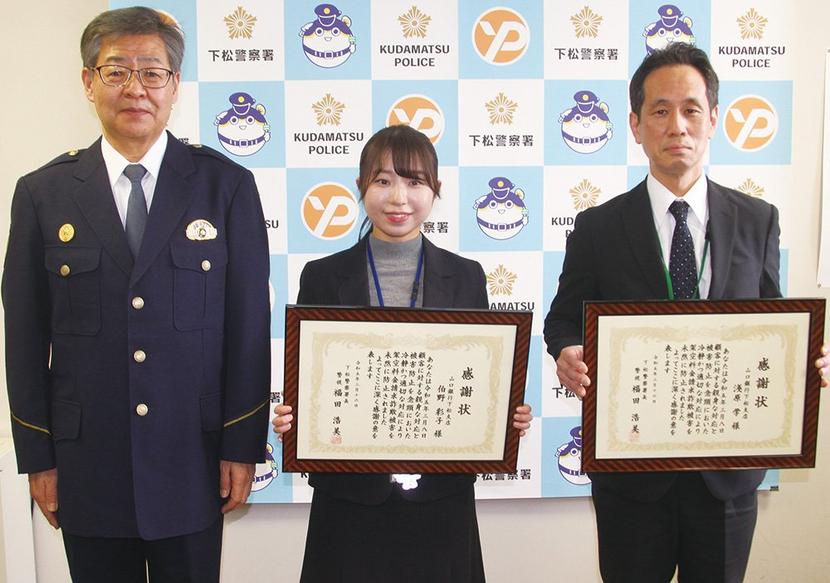 山口県下松市の下松警察署(福田浩美署長)は16日、うそ電話詐欺被害を未然に防いだ功績で、下松市桜町の山口銀行下松支店(武居直人支店長)の行員、伯野彩子さん(2...