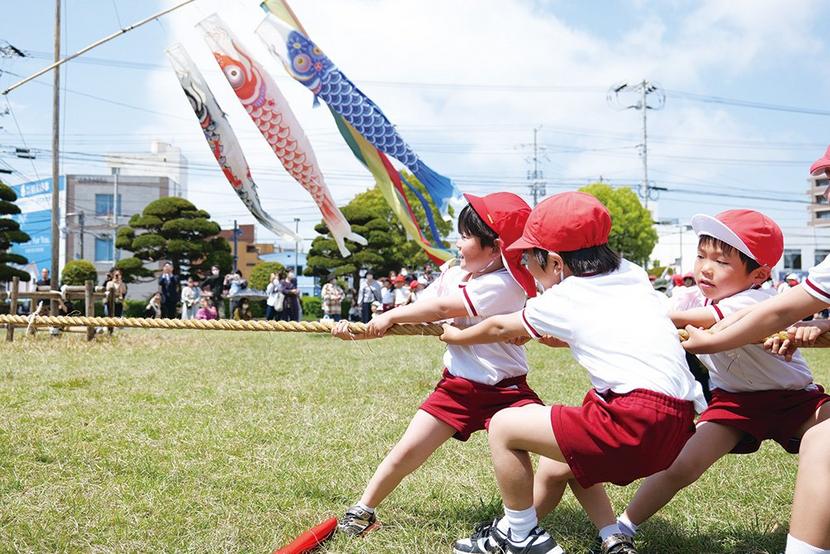 下松市役所の芝生広場グリーンプラザで4月28日、掲揚されたこいのぼりの下で保育園児が競技をする「こいのぼりまつり」が開かれた。主催は県保育協会下松支部(宝城正...