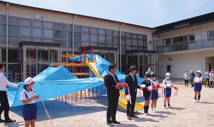 テープカットと同時に除幕される滑り台つきジャングルジム