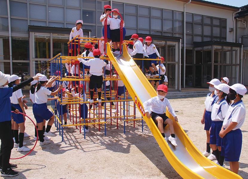 開校150周年記念事業で 山口県下松市の下松小(西本隆校長、676人)に15日、開校150周年記念事業で滑り台つきのジャングルジムが完成し、1年生111人が使...