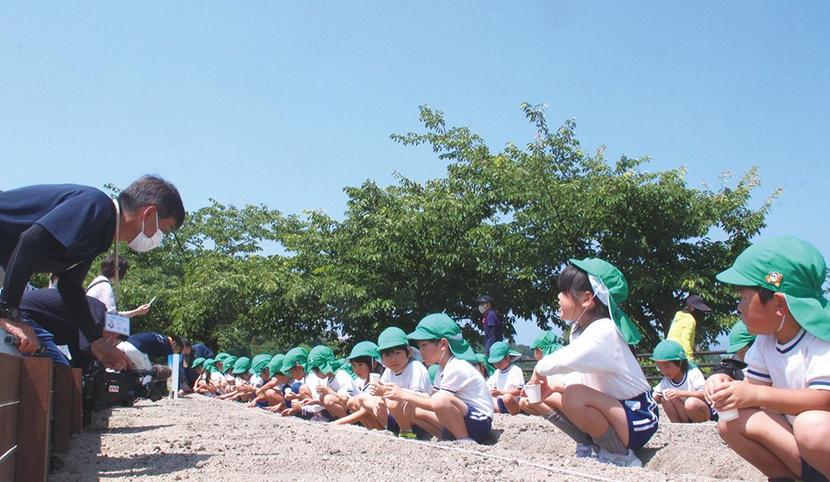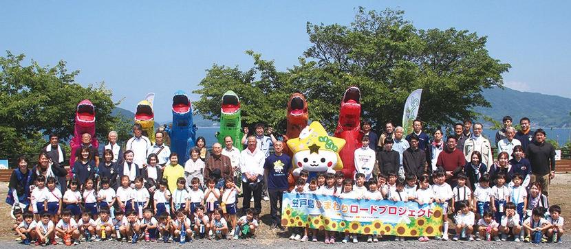 下松市観光協会(三池孝道会長)の「ひまわりロードプロジェクト」の種まきが16日、山口県下松市笠戸島の県道沿いの潮風ガーデンで開かれ、桜町の末光幼稚園(杉尾久子...