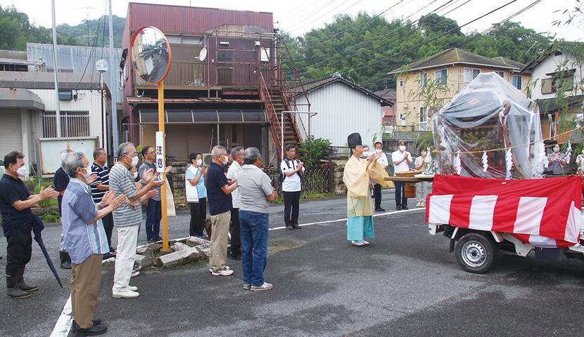 みこしに拝礼する神足宮司と参加者