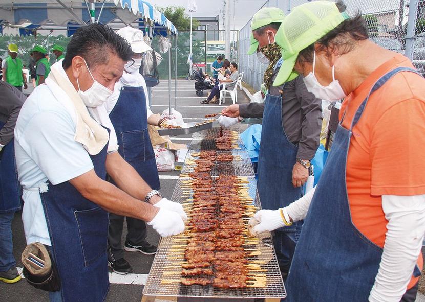 バザーの焼き鳥を焼く地元の人たち