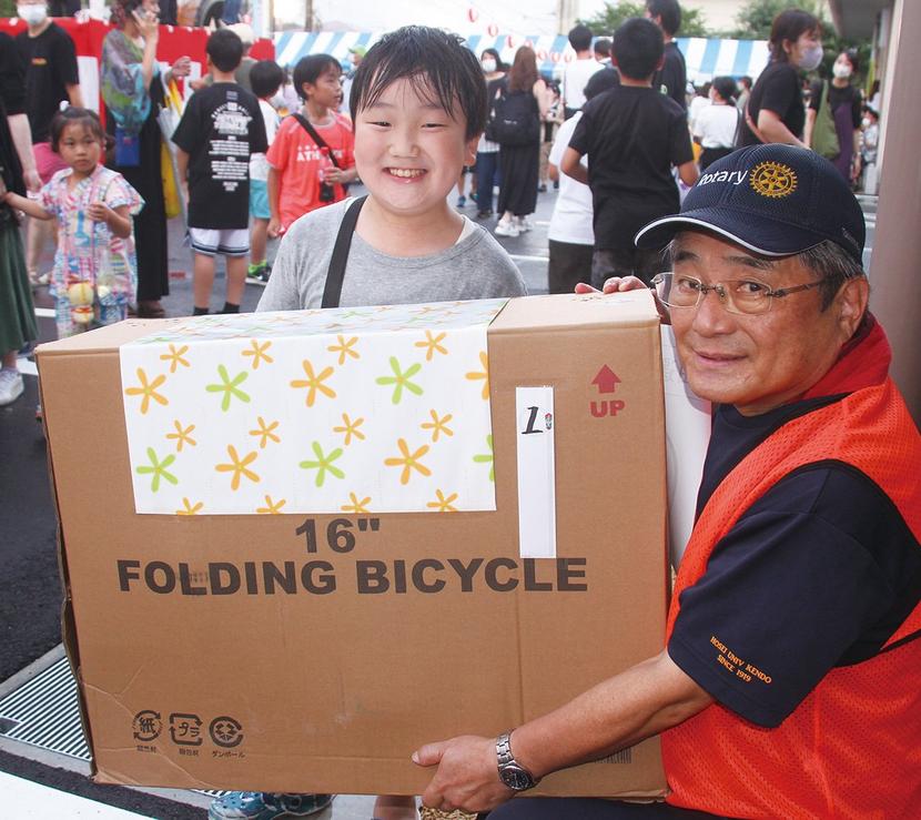 1等賞を持つ佐藤さんと風井実行委員長(右)