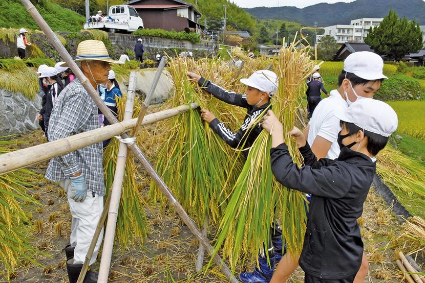 山口県下松市の久保小(松本敏訓校長)の5年生44人が25日、学校近くの水田で、かまを使った稲刈りとはぜかけを体験した。 この活動は猪本英雄さん(76)が所有...