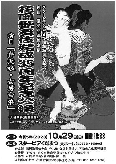 山口県下松市のスターピアくだまつ大ホールで29日(日)、花岡歌舞伎結成35周年記念、内山慧(さとし)先生追悼公演が開かれる。 演目は故内山慧さんが下松の方言...