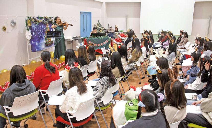歯科衛生士を育成する下松市東柳1丁目の下松デンタルアカデミー専門学校(栗田英見学校長、51人)で19日、クリスマス会が開かれた。バイオリンやピアノ演奏、芋料理...