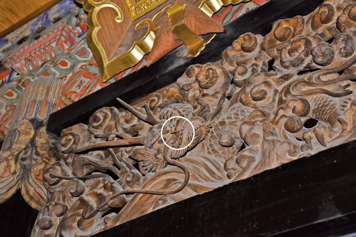 それが、この龍は西念寺に掛けられていた欄間の彫刻の龍だとわかり、住職はこれを作った長五郎に「二度と飛んで出ないように止(そど)めの釘を打ってほしい」と頼み、それから龍の飛んだ姿を見かけた人がいなくなったという。
