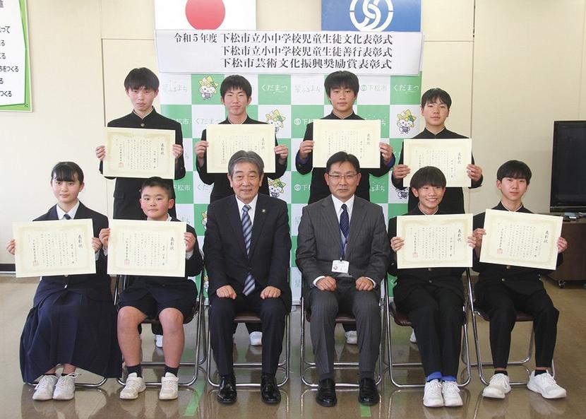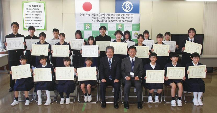 下松市教委の小中学校児童生徒文化表彰式・善行表彰式と高校生の芸術文化振興奨励賞の表彰式が13日、市役所で開かれ、児童生徒文化表彰は10人と4団体▽児童生徒善行...