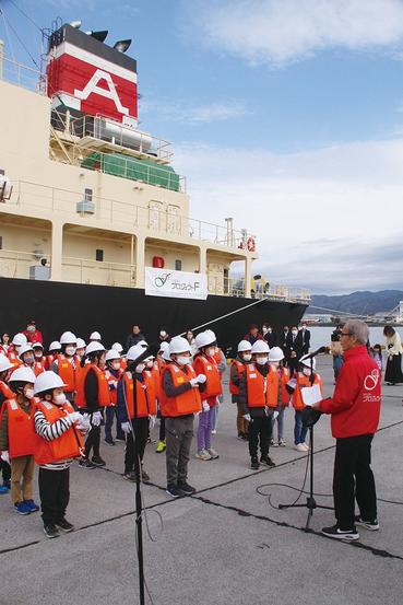 山口県下松市のNPO法人プロジェクトFくだまつ(中村隆征理事長)の「くだまつ小学生タンカー船見学会」(新周南新聞社など後援)が3月28日、下松第一埠頭に停泊中...