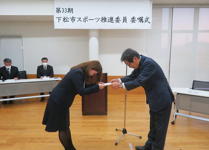 国井市長から委嘱状を受け取る植田さん(下松市提供)