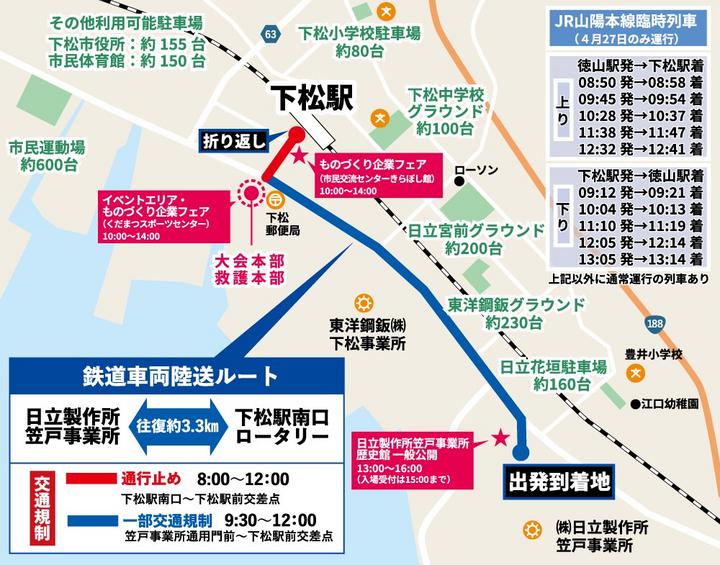 当日は午前9時半に日立笠戸でスタートセレモニーとテープカットがあり、10時に電車2両の陸送が始まる。10時半に折り返し点の下松駅南口前でもセレモニーがあり、終了次第、陸送の復路が始まる。11時半ごろに日立笠戸に戻る。