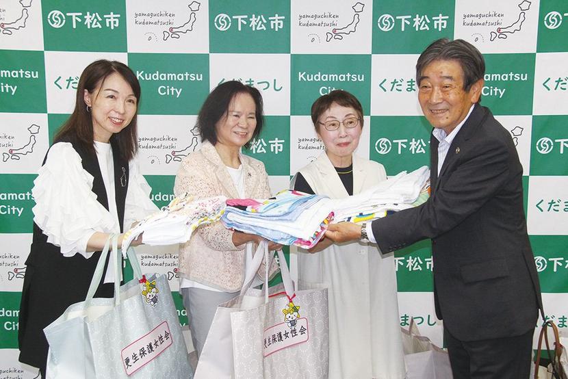 山口県の下松市更生保護女性会(森氏加代子会長、146人)は4日、会員全員で制作したぞうきんと足ふきマット計324枚を同市に寄付した。市内の保育園10園に配布し...