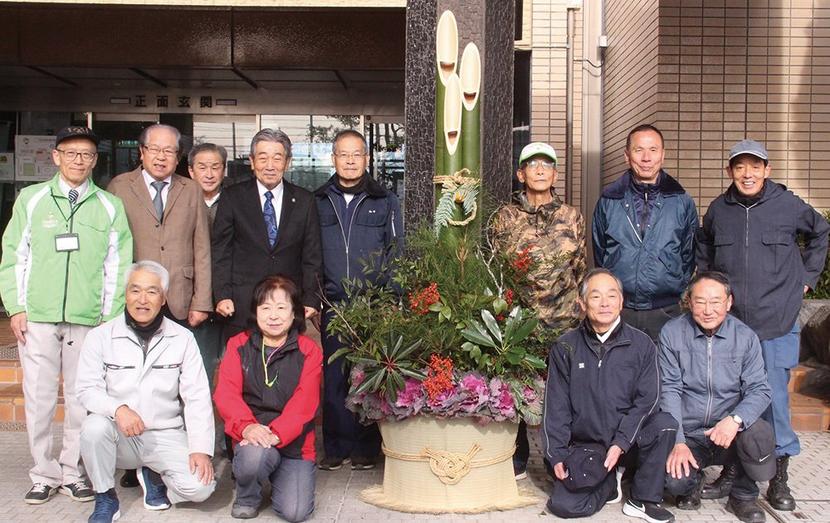 門松を国井市長、永田議長と囲む久保福祉協メンバー(市役所)