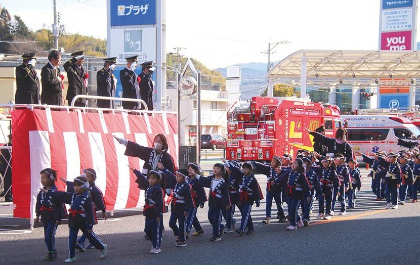 下松市の消防出初め式が11日、スターピアくだまつ大ホールとゆめタウン下松第1駐車場、ゆめステージで開かれ、市消防団員や市消防本部の消防士ら約300人が防災への...