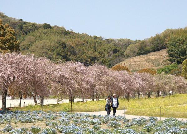 下松市河内の下松スポーツ公園の花畑で、シダレザクラとネモフィラ、菜の花が同時に見ごろを迎え、カラフルな花の美しさが訪れる人を魅了している。 シダレザクラは3...