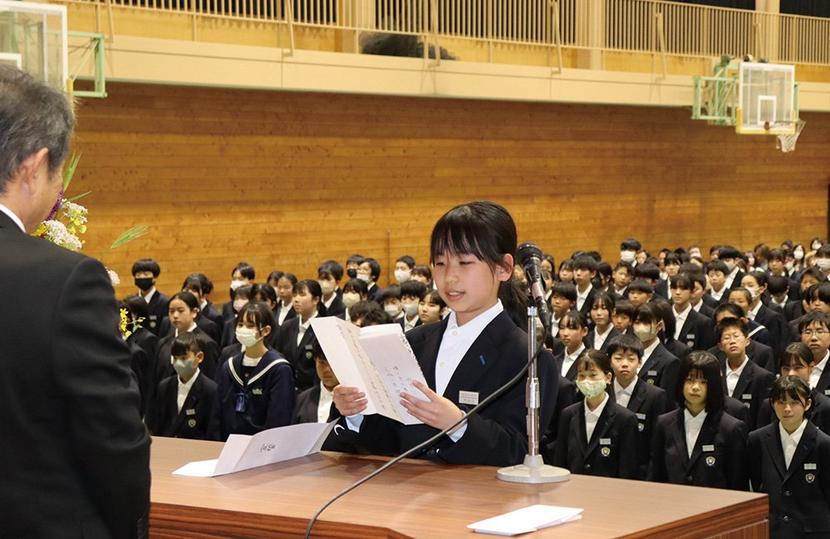 宣誓する新入生代表の西牟田さん