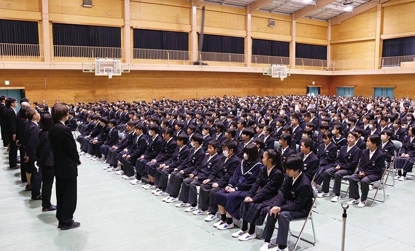 担任教諭のあいさつを聞く新入生