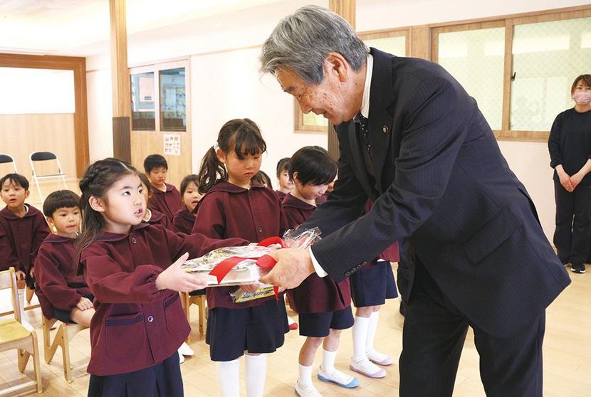 国井市長から図鑑を受け取る園児(くぼ保育園)