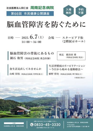 下松市の周南記念病院(橋谷田博院長)の第66回市民健康公開講座が6月7日(土)午後2時から、スターピアくだまつ2階展示ホールで、同病院医師、職員3つの講演を開...