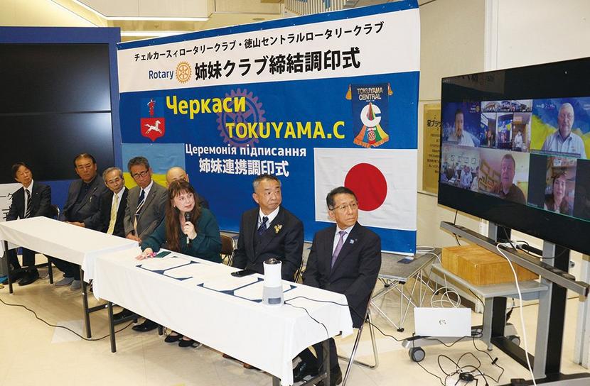 下松市と周南市で活動する徳山セントラルロータリークラブ(RC=岩本英樹会長、21人)は3日、ウクライナのチェルカースィRCと姉妹縁組を締結。締結式は両国をオン...