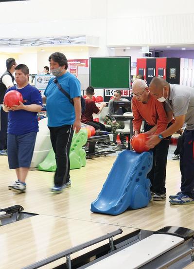この招待を楽しみにしている利用者も多く、ゲームが始まると見事なフォームを決めたり、ボールを両手で持ってそっと転がす人、スロープ状のボールスライダーでボールを転がす人など、一人ひとりの楽しみ方でボウリングを満喫した。