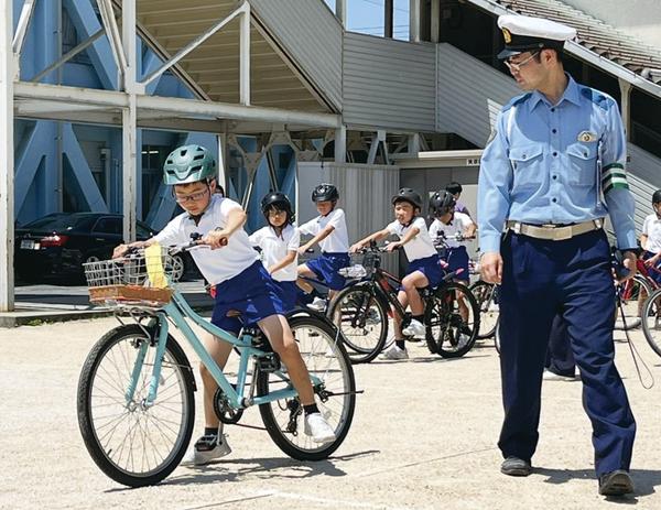 【下松】自転車の乗り方、点検を学ぶ 久保小4年生・警察官の指導受ける
