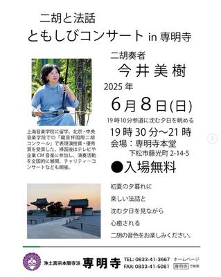 下松市藤光町の浄土真宗本願寺派専明寺で8日(日)午後7時30分から9時まで、本堂を活用した二胡コンサートと寺のライトアップを楽しむ「二胡と法話 ともしびコンサ...