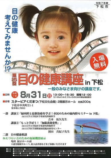 日本眼科医会と山口県眼科医会が主催する第25回目の健康講座 in 下松(新周南新聞社など後援)が、31日(日)午後1時から下松市のスターピアくだまつ展示ホール...