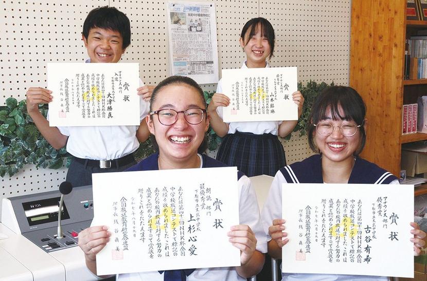 上杉さんは「これからも放送活動を続け、将来は話すことや伝える仕事に就きたい」と意欲を見せる。アナウンス部門で優秀賞の古谷有希さん、山本結琳さん、入選の大津勝真さんも上杉さんの“日本一”をたたえ、さらなる努力を誓った。