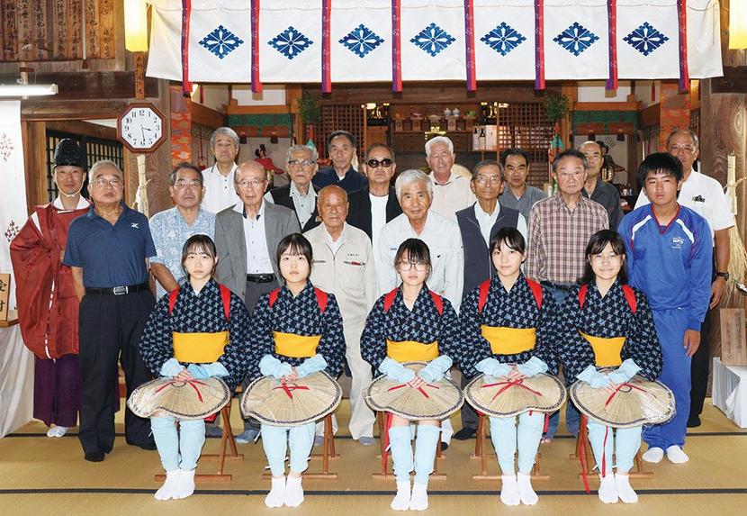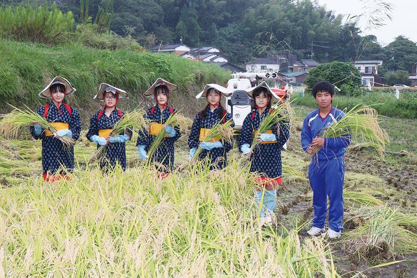 下松市河内の降松神社(神足篤彦宮司)の抜穂祭(ぬきほさい)が28日、同神社近くの神田(しんでん)で営まれ、小雨の中で早乙女(さおとめ)の中高生6人や総代が餅米...