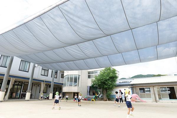 【下松】四恩幼稚園の園庭に大型サンシェード 園児「涼しい」と元気に走り回る