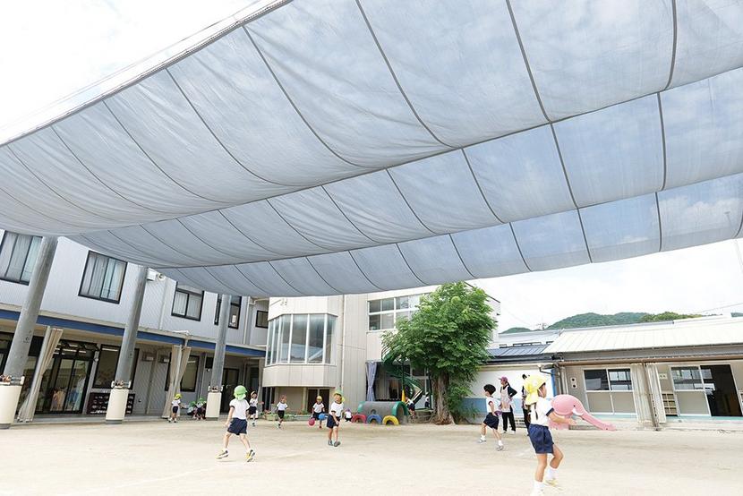 下松市末武上の学校法人四恩学園幼保連携型認定こども園四恩幼稚園(見山任昭園長)は熱中症対策のため、園庭に大型のサンシェードを設置した。 サンシェードは高さ6...