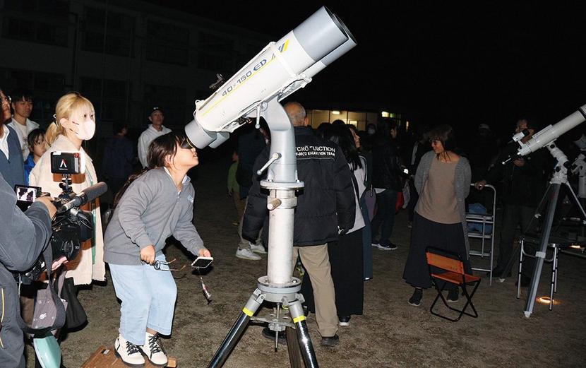 グラウンドで天体観測をする子ども