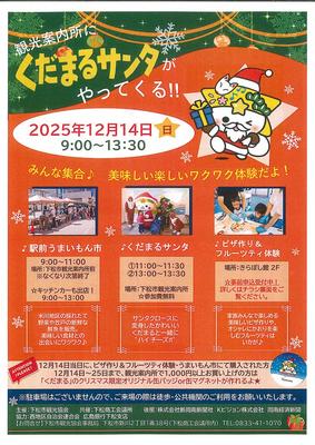 下松市観光協会はクリスマスを前に親子連れなどたくさんの人たちに楽しんでもらおうと、14日(日)午前9時から「くだまるサンタがやってくる!」(新周南新聞社など後...