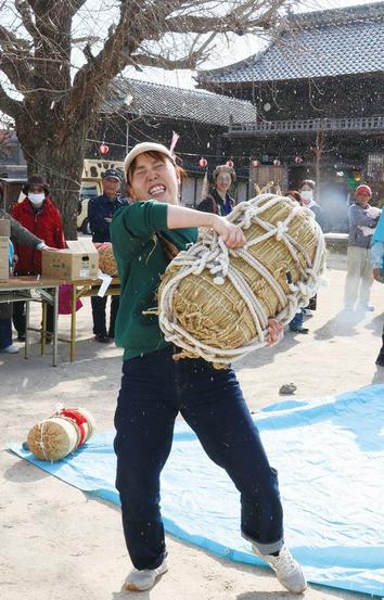 七福神の大黒天がまつられている下松市中市の妙見宮鷲頭寺(杉原孝明住職)で7日、新年恒例の「大黒市」が開かれ、女性や子どもが米俵を担いで5メートル先の台まで運ぶ...