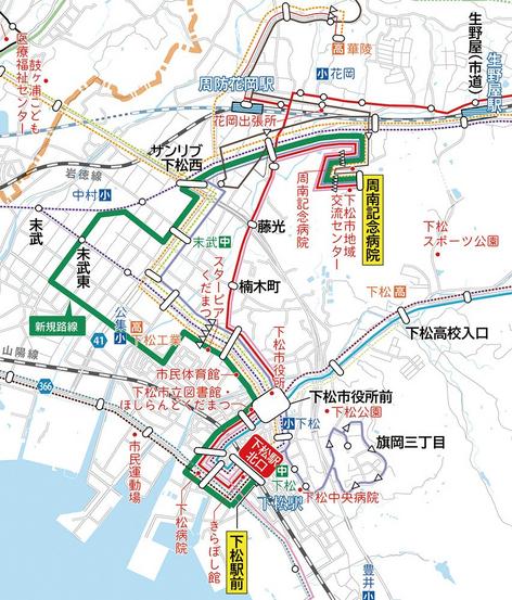 新しい路線は下松駅南口と生野屋南の周南記念病院を結ぶ約8キロで、市役所▽下松タウンセンター▽下松工高▽公集小▽末武公民館▽中村総合福祉センター▽中村小▽サンリブ下松の周辺を経由。所要時間は約30分。大半は市道で、県道や国道も若干ある。
