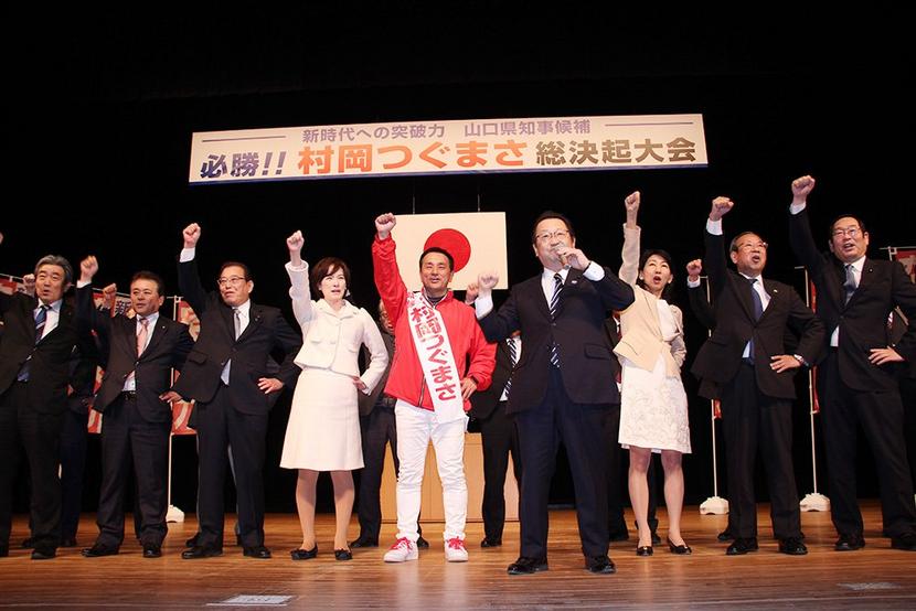 気勢を上げる村岡候補=下松市スターピアくだまつ