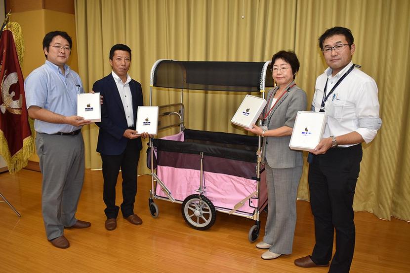 左から三崎、冨田、中村、白浜さんとアイパッド、ロングライトバス