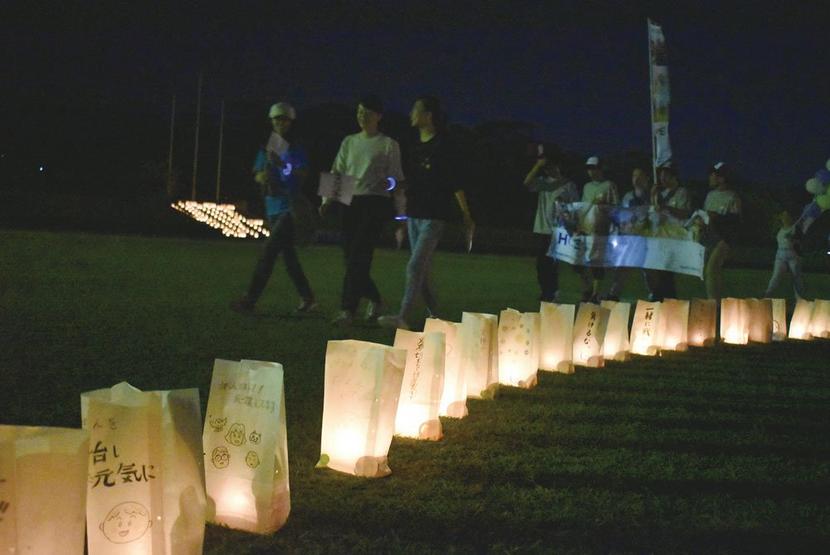 患者団体など11チームが参加し、5日午後1時からの開会式のあとフィールド内の1周が約200メートルのコースを横断幕などを手に歩き始めたが、最初の1周はがん患者、経験者だけで歩いた。コース沿いにはがん患者からのメッセージや患者への励ましの言葉が書かれたルミナリエ千個が並び、暗くなるとロウソクが入れられてルミナリエが暗闇に浮かび上がった。