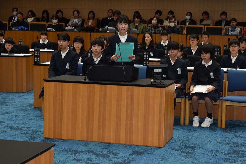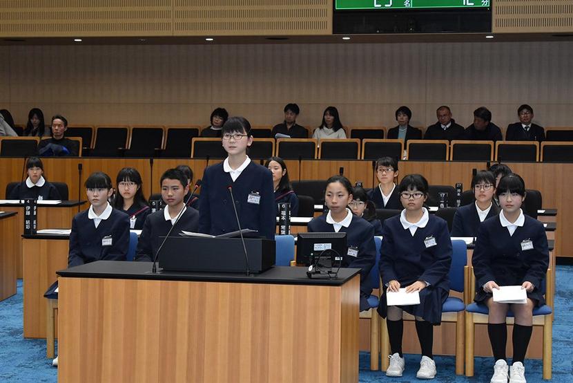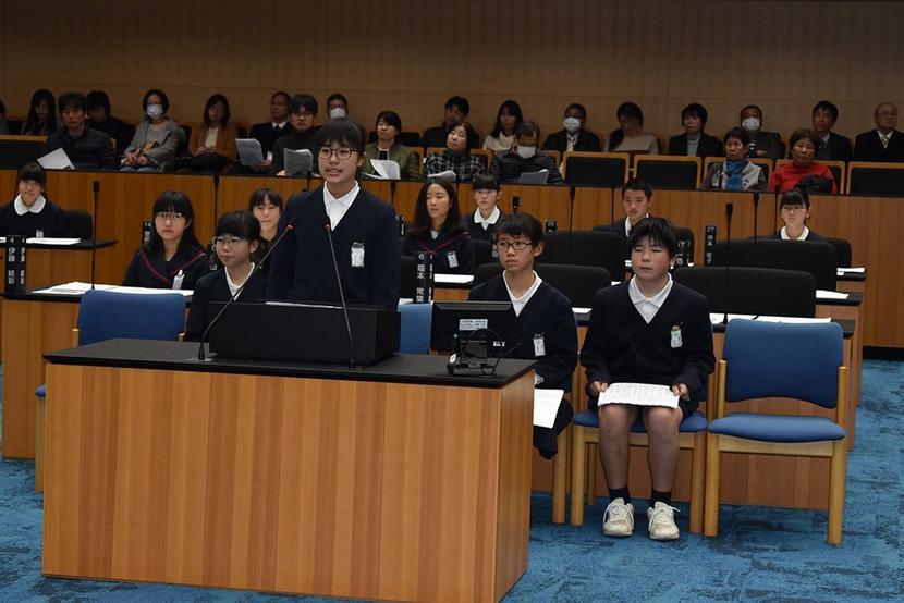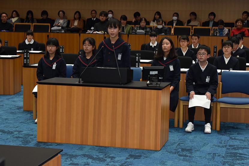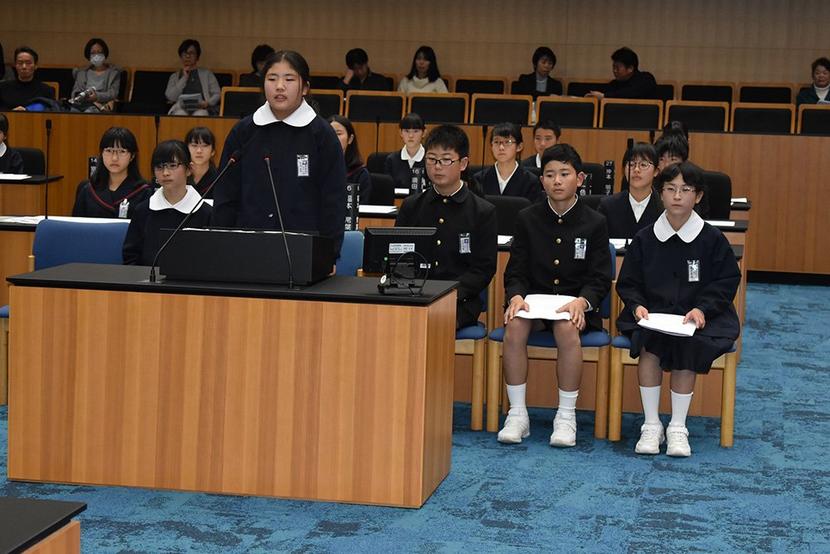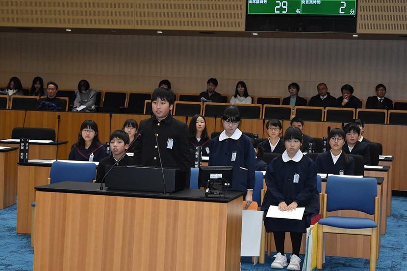 児童がまちづくりについて議会の一般質問の形で提言する周南市こども議会が1月31日に開かれ、菊川、岐山、須磨、福川南、八代、周陽小の6年生29人が「あいさついっ...