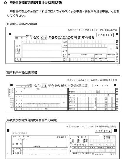 感染拡大で外出を控えるなど期限内に申告することが困難な人に配慮。申請書などを提出する必要はなく、申告書の余白に「新型コロナウイルスによる申告・納付期限延長申請」と記載する。