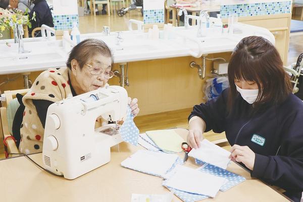 新型コロナウイルスの感染拡大の影響でマスクが不足する中、周南市久米のツクイ周南久米デイサービスセンターで、50代から90代の利用者が趣味活動の時間を活用してマ...